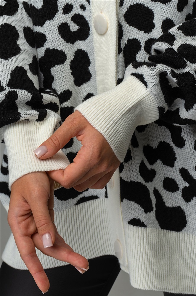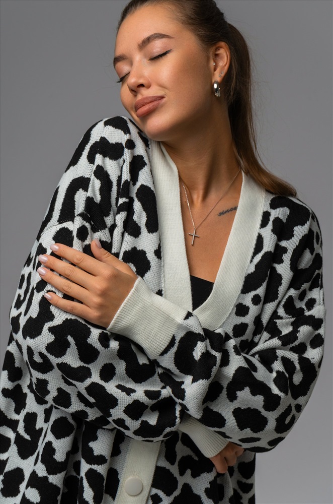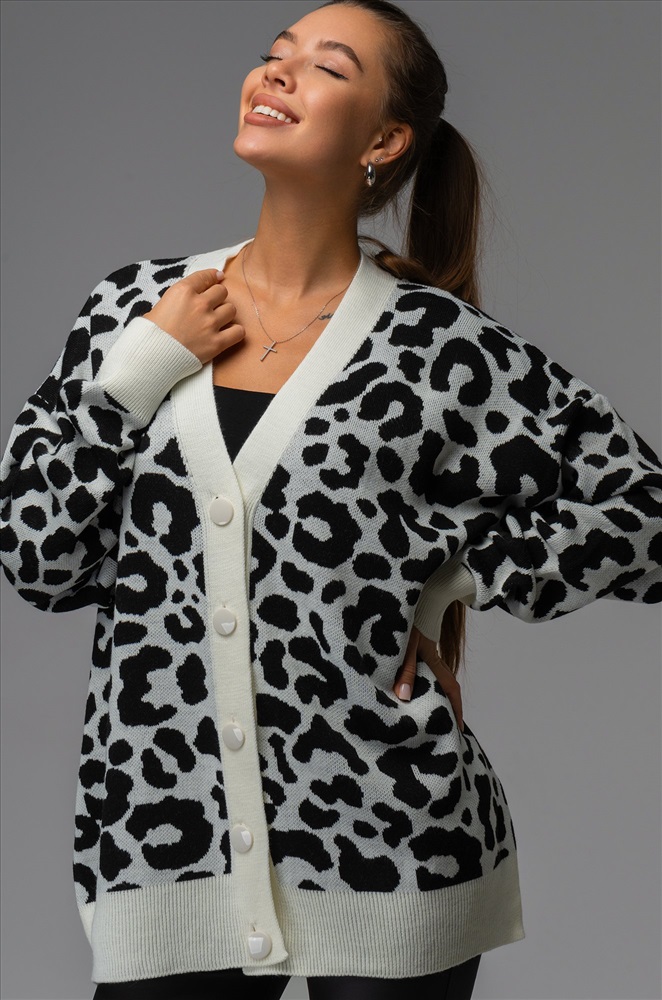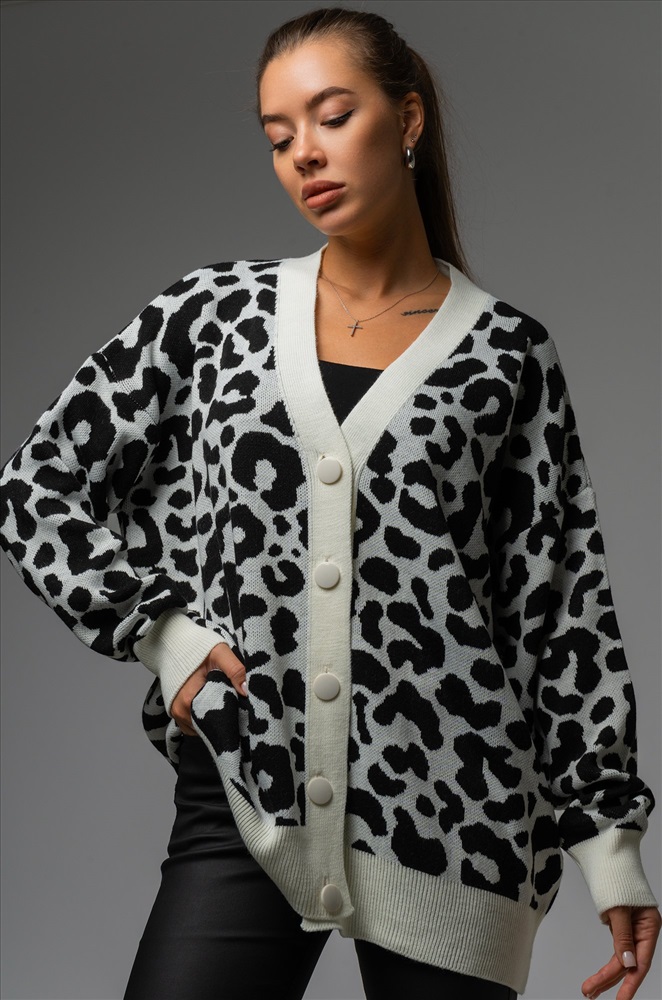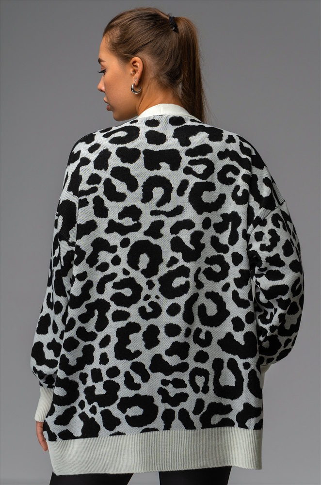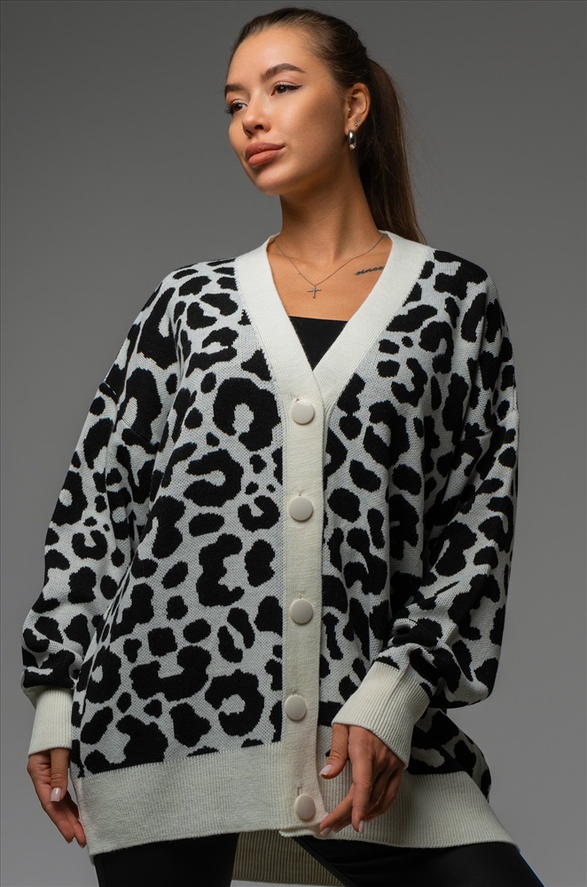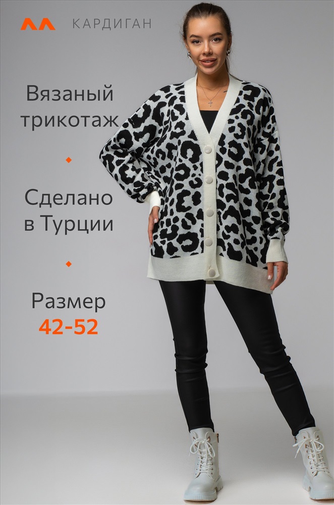 Будьте смелее с женским леопардовым кардиганом в своих экспериментах. Удлиненная модель оверсайз станет идеальным дополнением гардероба и позволит создать множество стильных сочетаний для любого случая. Выполненный из мягкого вязаного трикотажа кардиган отлично сохраняет тепло и дарит комфорт в любой день. Полушерстяной состав делает кофту приятной на ощупь, а также долговечной. Вы оцените ее уют даже в самые прохладные дни. Кардиган имеет свободный прямой крой и застежку на пуговицах, что придает ему особую изюминку. Длинная кофта отлично смотрится на любой фигуре, подчеркивая женственность и стиль. Леопардовый рисунок добавляет нотку экзотики и делает кардиган поистине оригинальным. Шерстяной кардиган идеально подойдет для женщин всех возрастов, ищущих комфорт и элегантность в одном. Он станет прекрасным выбором для ярких повседневных прогулок. Не упустите возможность добавить в свой гардероб такую красивую и универсальную кофту! Модель Анфиса, рост 170 см, параметры 88-67-97 см. На ней кардиган единого размера 42-52.