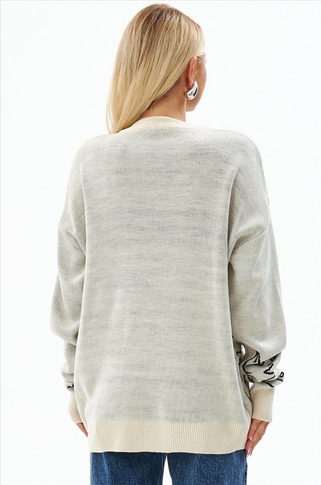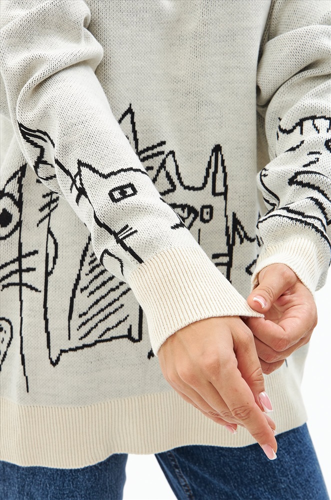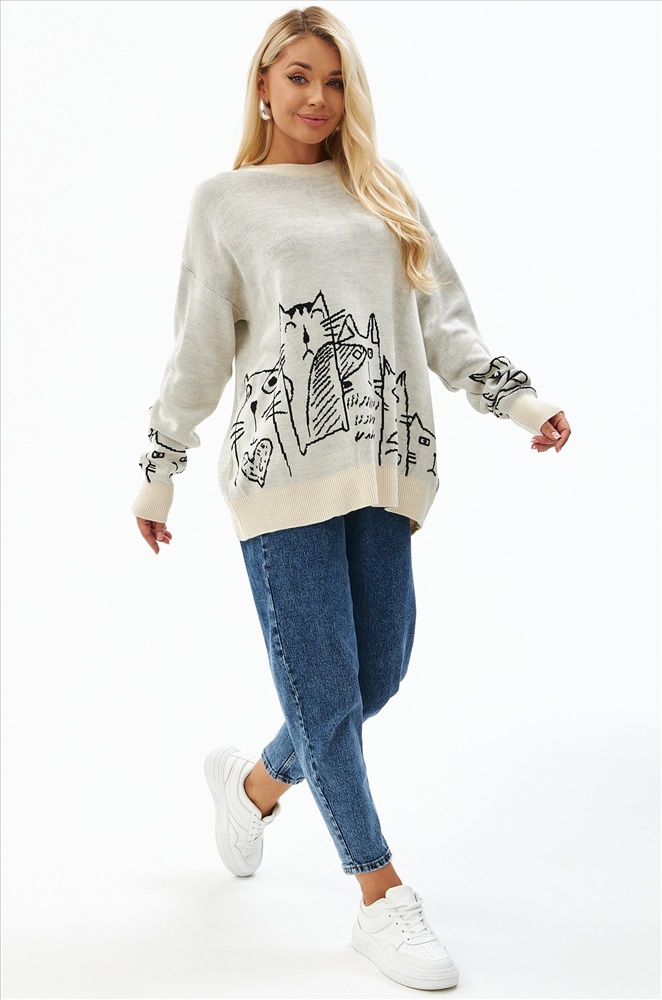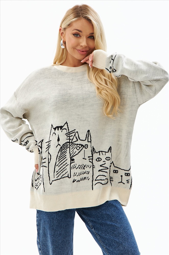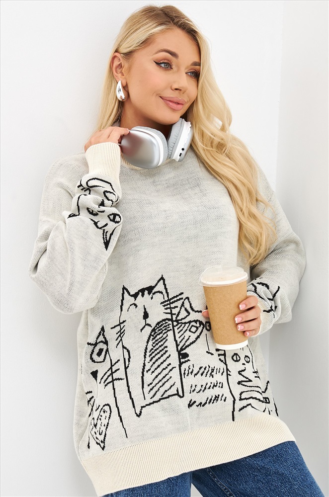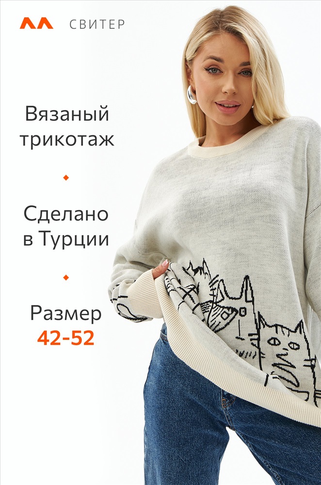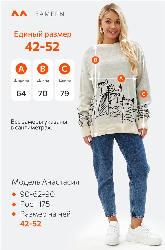Женский джемпер с рисунком кошки — находка для тех, кто любит весело и тепло проводить зимние дни. Свитер оверсайз с оригинальным рисунком наполнит уютом каждый день. Вязаный трикотаж с хлопком, шерстью и акрилом в составе подарит мягкость и тепло, которые необходимы в холодное время года. Идеальное сочетание делает свитер приятным на ощупь и стойким к износу. Свободный крой, длинные рукава и спущенное плечо придают джемперу расслабленный вид, а забавный рисунок котики добавляют ему уникальности. Этот трикотажный свитшот подойдет для женщин, которые ценят комфорт и немного веселья. Он идеален для уютных вечеров дома или прогулок по городу. Благодаря универсальному единому размеру свитер подходит для любого типа фигуры. Модель Анастасия, рост 175 см, параметры 90-62-90 см. На ней белый джемпер единого размера 42-52.