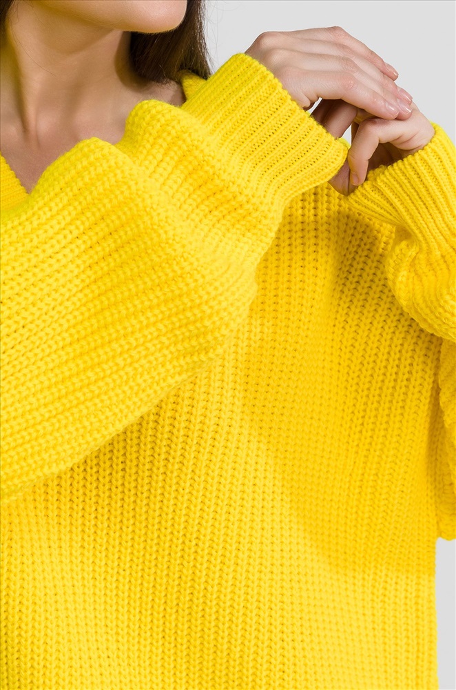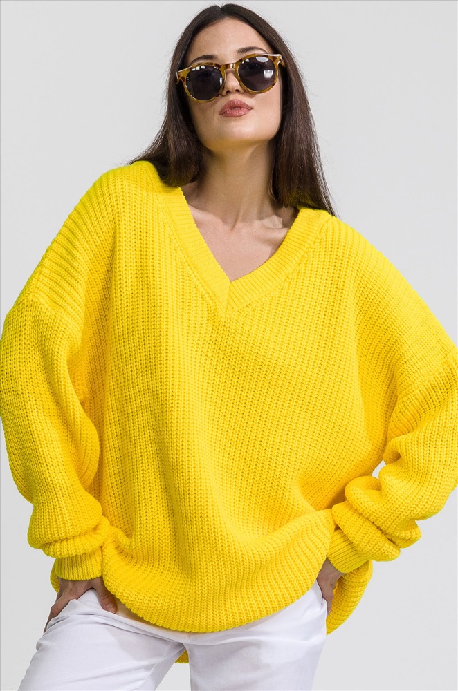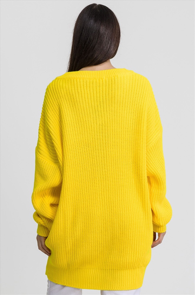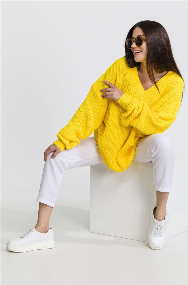 Женский удлиненный джемпер оверсайз с V-образным вырезом подчёркивает ключицы, аккуратно открывает шею, раскрывая изящность своей обладательницы. Благодаря свободному крою и минималистичному дизайну желтый свитер oversize надолго сохранит свою актуальность.