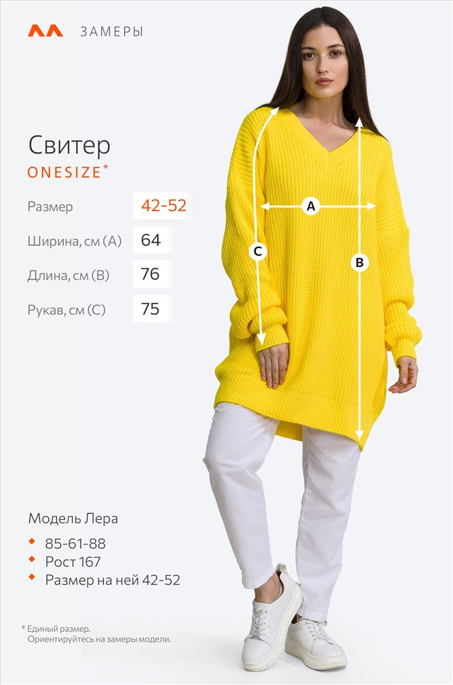 Модель Лера, ее рост 167 см, параметры: 85-61-88. На ней свитер единого размера 42-52.