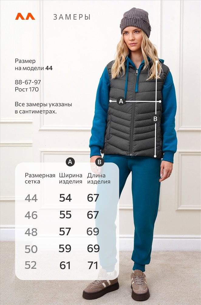 Преимущества: – инновационный утеплитель Down Cotton, синтепон (плотность 160 г/м2) – лёгкий, тёплый и держит форму; – ветрозащитная болоньевая ткань и водоотталкивающее покрытие; – продуманная функциональность – удобные карманы на молнии; – оригинальная диагональная отстрочка как стильный акцент. Теплая жилетка для женщин – это универсальный элемент демисезонного гардероба. Она идеальна для осенних и весенних прогулок, путешествий и повседневных образов. Рекомендации по уходу за болоньевым жилетом: • стирать при t° до 30°С в деликатном режиме; • использовать мягкие моющие средства без хлора; • застегнуть молнию и вывернуть изделие перед стиркой; • стирать отдельно, отжимать на минимальных оборотах или без отжима; • сушить в расправленном виде на горизонтальной поверхности или на вешалке, вдали от солнца и батарей; • после высыхания слегка взбить наполнитель для объёмности; • гладить не требуется — ткань держит форму сама.