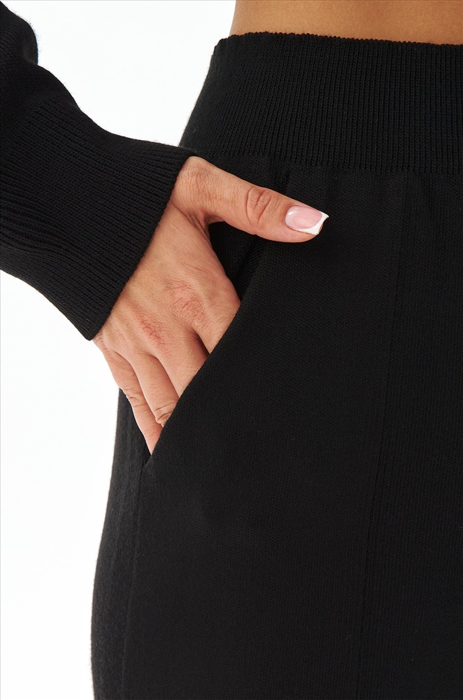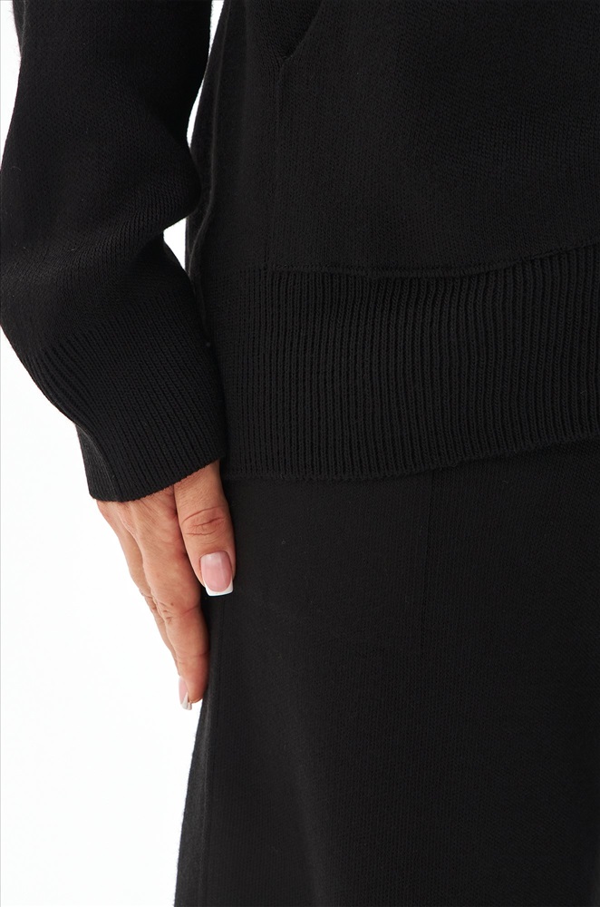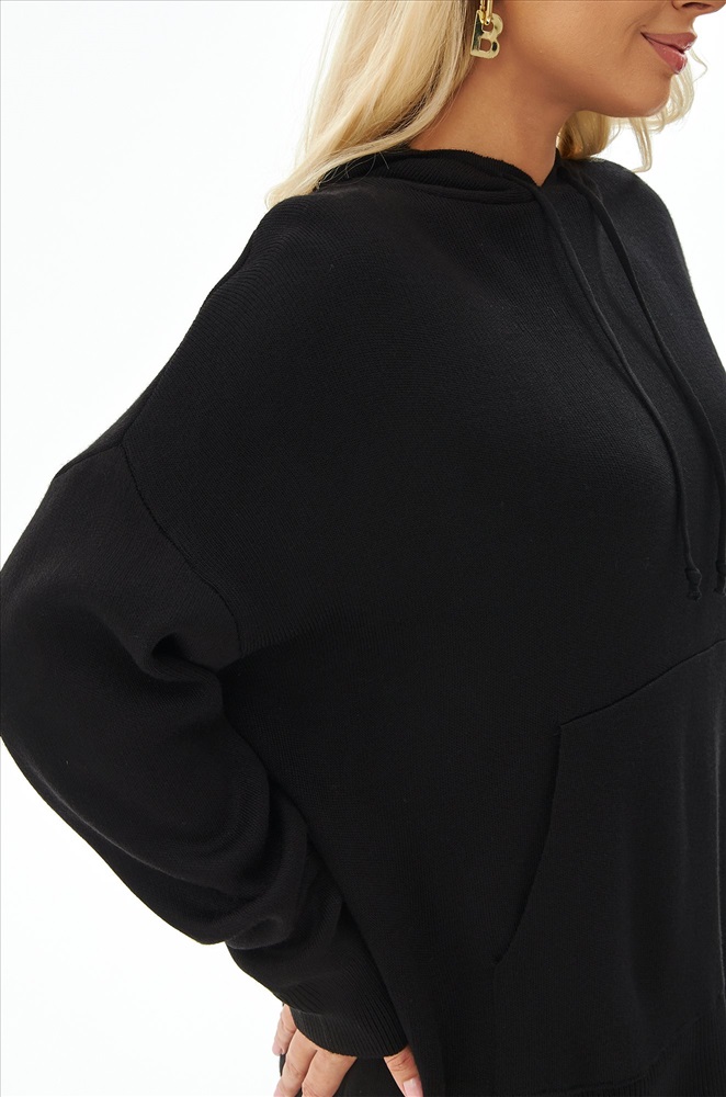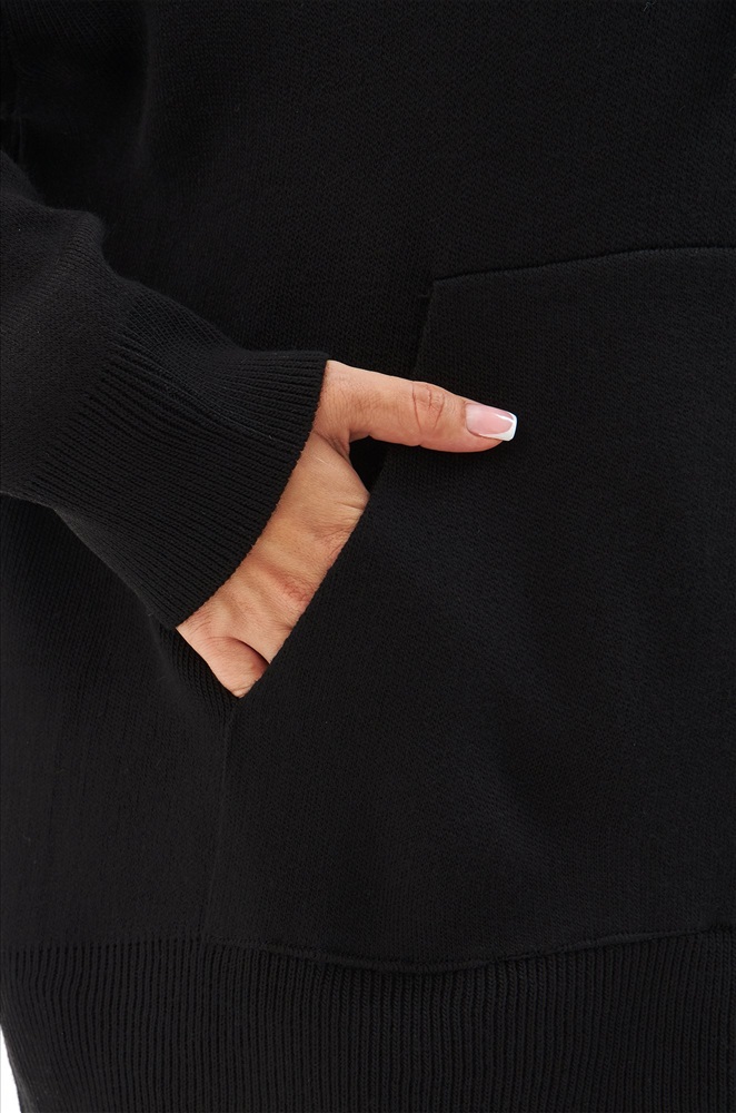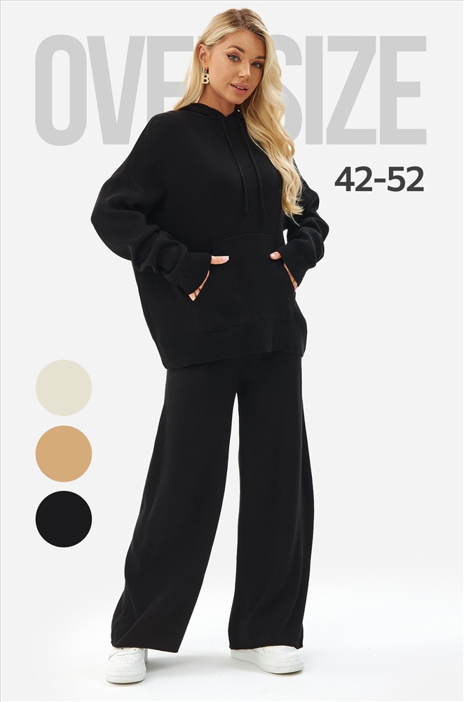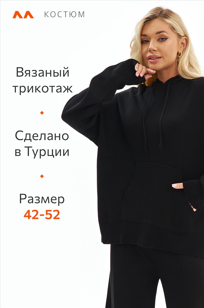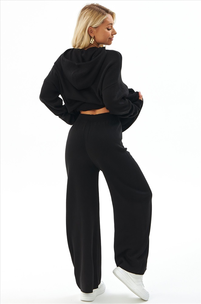 Женский костюм из вязаного трикотажа черного цвета — идеальный выбор для стильных и уверенных в себе леди. В комплекте джемпер с капюшоном и брюки палаццо на резинке.