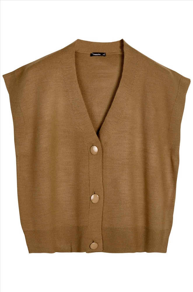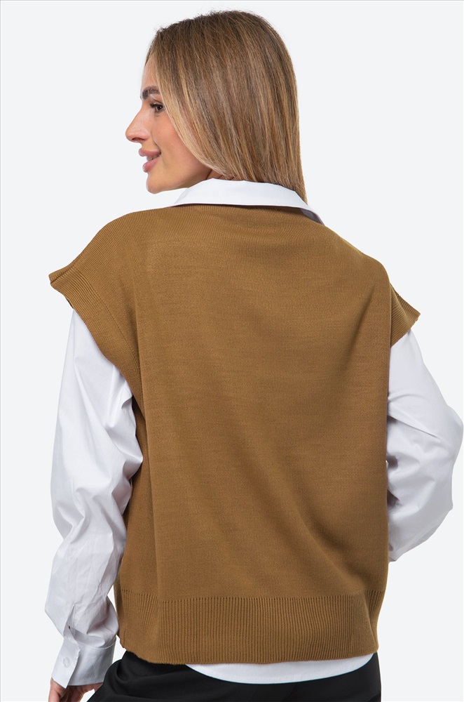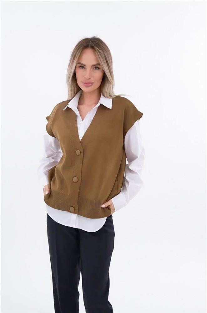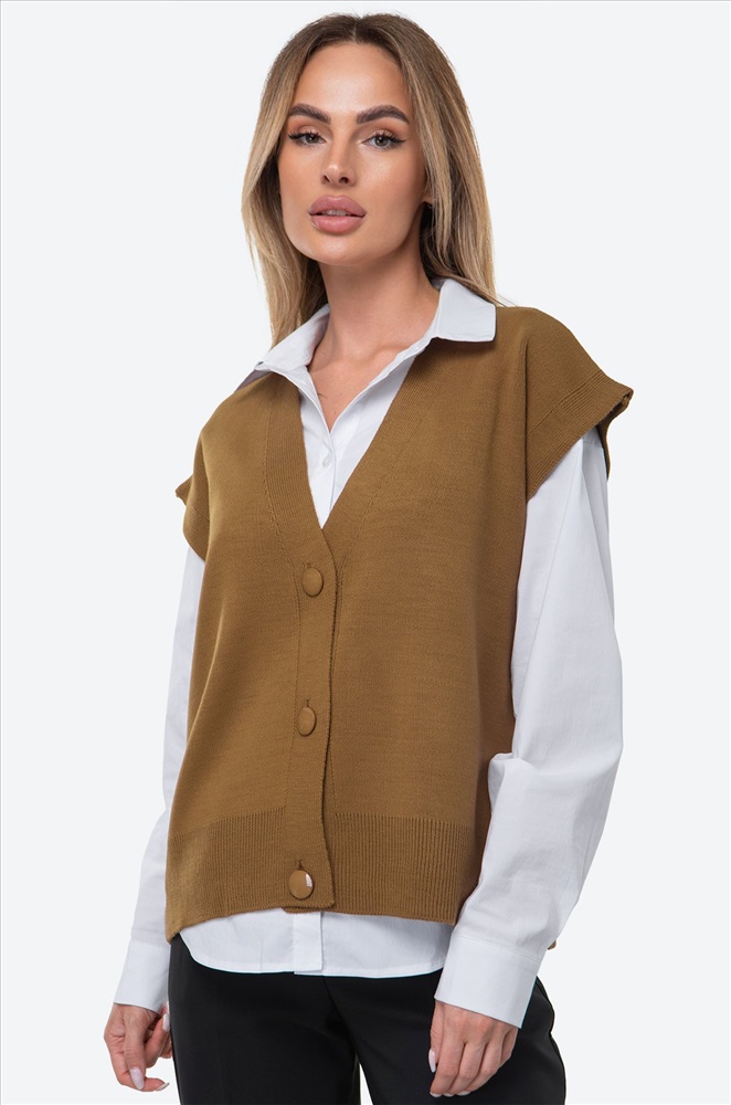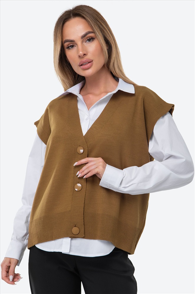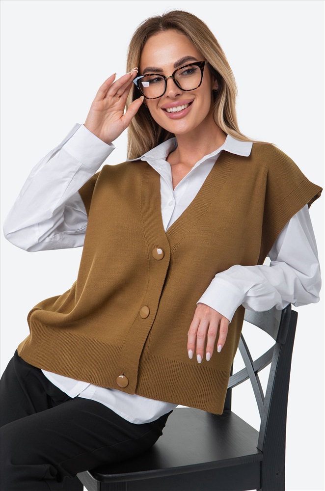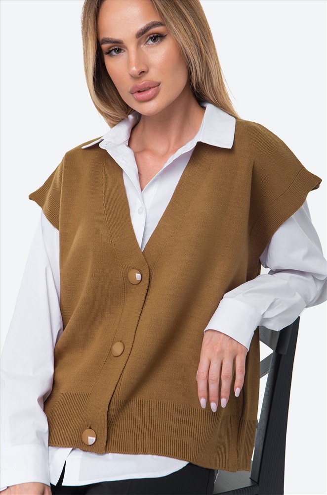 Классический вязаный жилет – базовая модель в женском гардеробе, которая поможет создать трендовый многослойный образ. Женская безрукавка с V-образным вырезом и застежкой на крупные пуговицы выполнена в коричневом цвете.