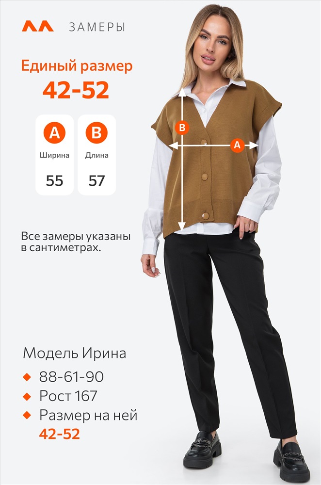 Модель Ирина, ее рост 167 см, параметры 88-61-90 см. На ней жилет из трикотажа, размер 42-52.