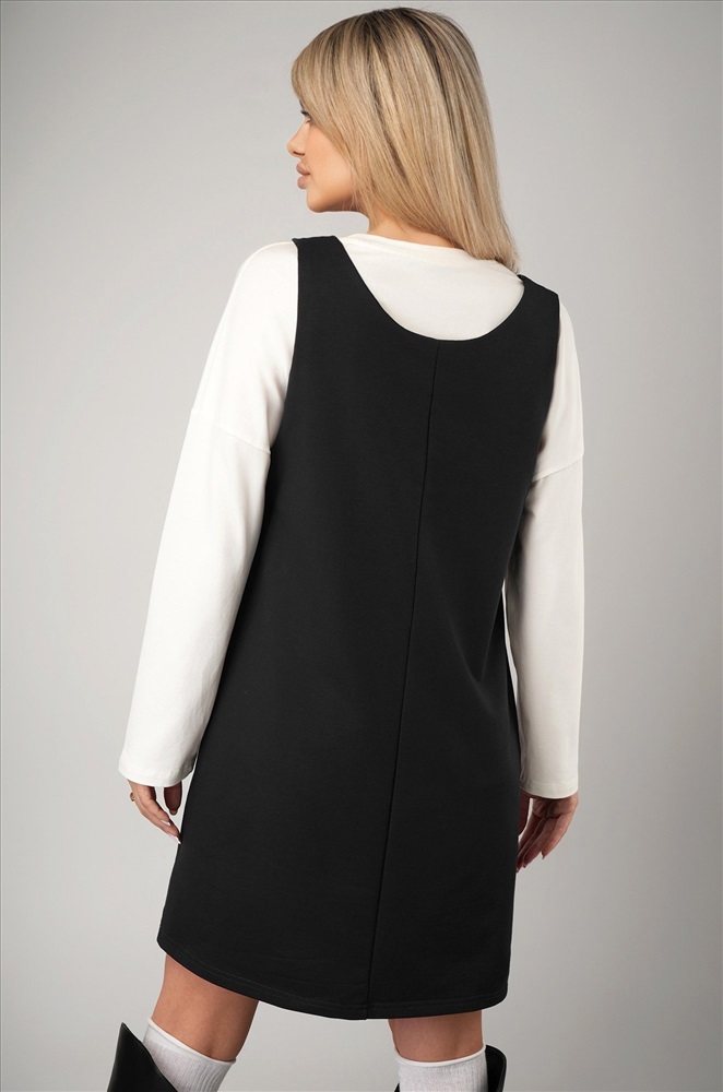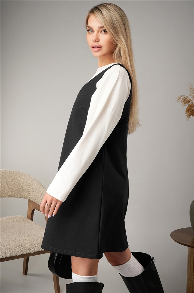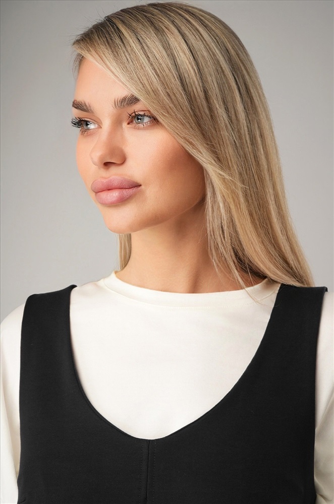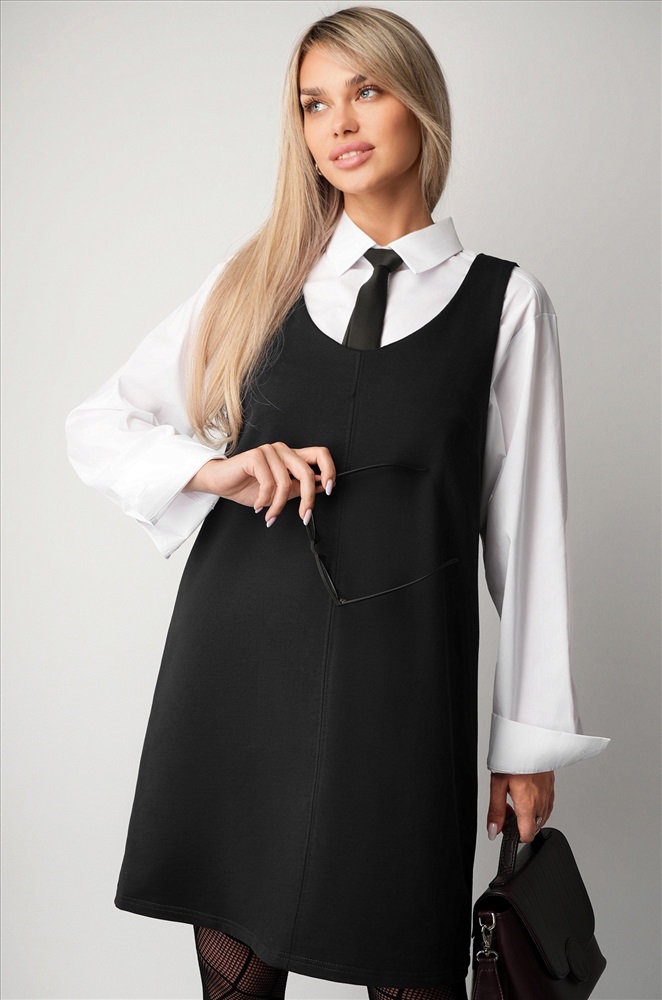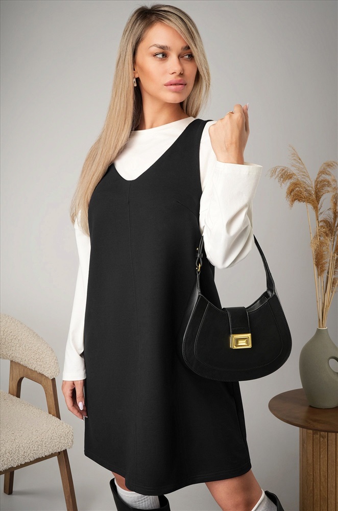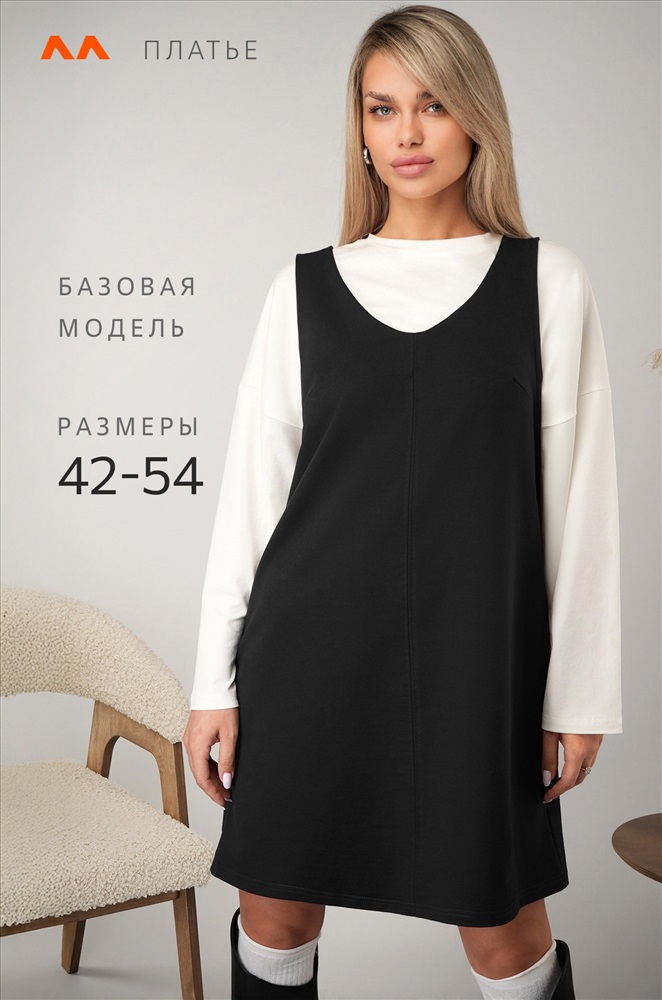 Преимущества: – плотный трикотаж (240 г/м2), держит форму; – однотонное короткое платье, не перегруженное деталями; – универсальность: уместно как повседневное решение, так и вариант для офиса, школы и универа; – прямой крой, который легко становится основой стильного образа; – женское платье, подчеркивающее естественную элегантность. Свободный силуэт оверсайз, глубокий круглый вырез и отсутствие рукавов делают трикотажный сарафан воплощением современного минимализма. Хлопковое черное платье создано для женщин, которые ценят гармонию комфорта и стиля — на работе, на прогулке или в любом повседневном моменте. Рост модели 170 см, параметры: объем груди 85, объем талии 66, объем бедер 91. На ней размер 44.