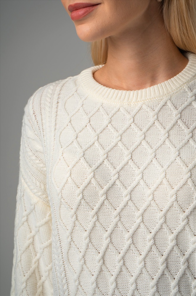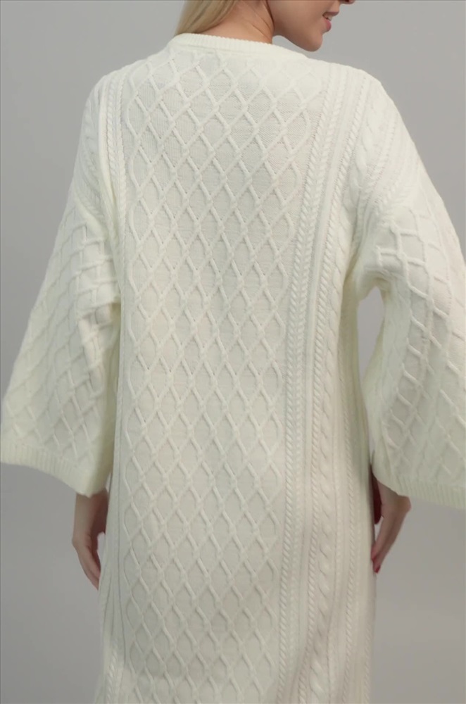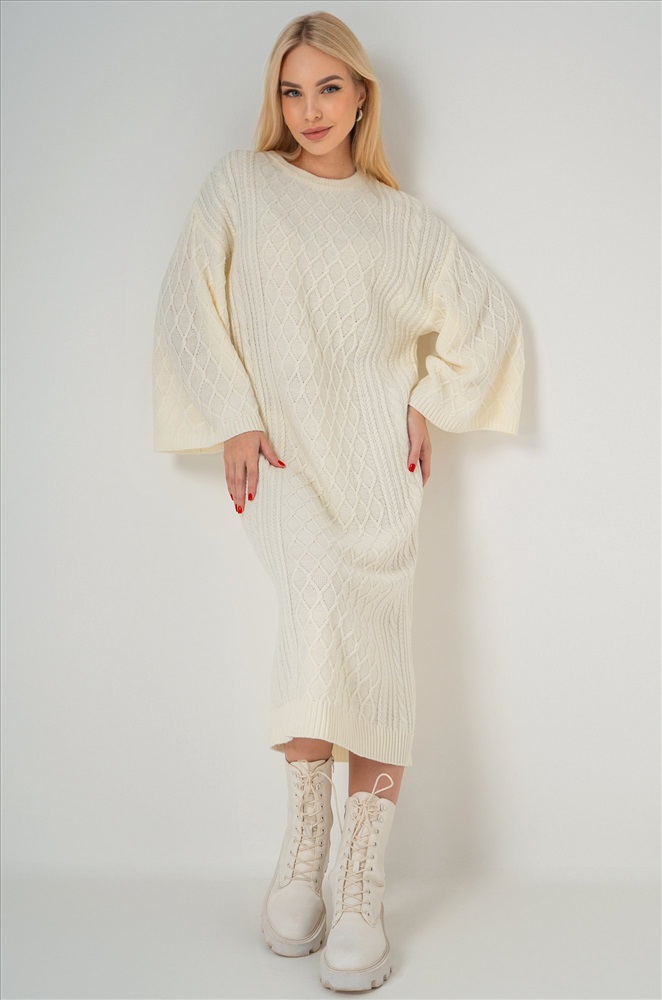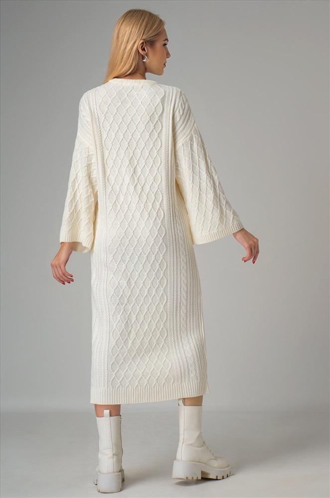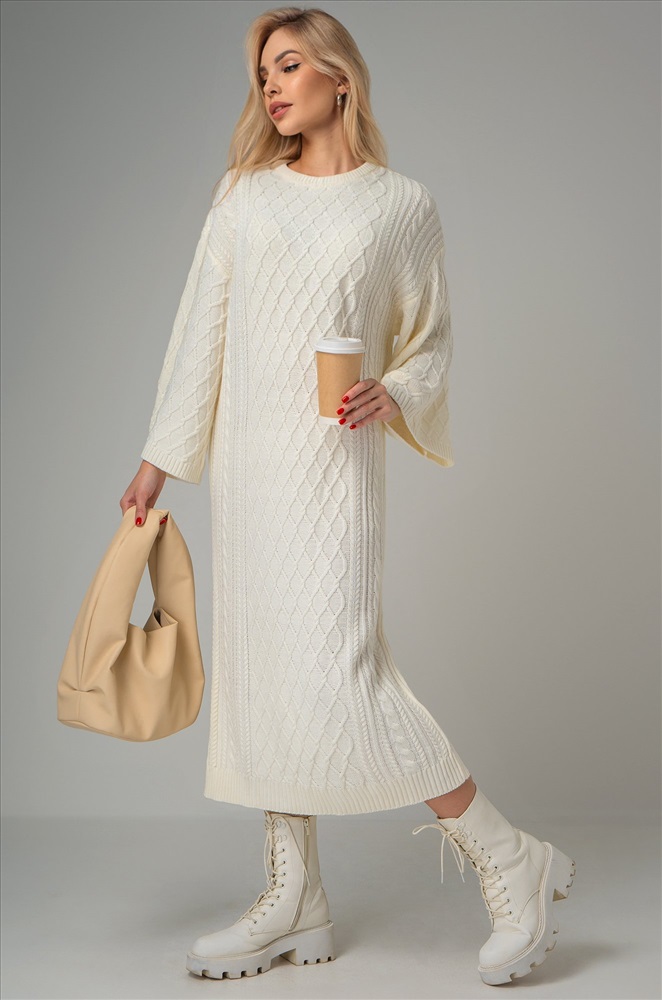 Выполненное из вязаного трикотажа длинное платье молочного цвета отличается мягкостью и нежностью. Плотный трикотаж с оригинальной вязкой ромбы и косички сохраняет тепло, делая платье идеальным для осени, зимы и весны. Однотонное платье имеет прямой крой оверсайз со спущенным плечом и длинным свободным рукавом, что создает расслабленный силуэт. Круглый вырез и широкий расклешенный рукав дополняют стильный образ, а свободный крой и длина миди подчеркивают комфорт и утонченность. Это платье создано для женщин, ценящих комфорт и стиль в демисезонный и зимний период. Удлиненное вязаное платье создает неповторимый образ и придает элегантность каждому движению. Универсальный размер подходит для различного типа фигур, что делает его отличным выбором для создания элегантных образов на каждый день. Модель Даша, рост 175 см, параметры 82-60-92 см. На ней платье единого размера 42-48.