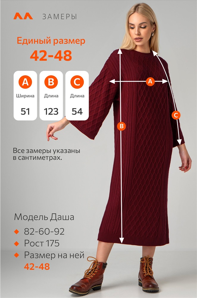 Выполненное из вязаного трикотажа длинное платье цвета бордо отличается мягкостью и нежностью. Плотный трикотаж с оригинальной вязкой ромбы и косички сохраняет тепло, делая платье идеальным для осени, зимы и весны. Однотонное платье имеет прямой крой оверсайз со спущенным плечом и длинным свободным рукавом, что создает расслабленный силуэт. Круглый вырез и широкий расклешенный рукав дополняют стильный образ, а свободный крой и длина миди подчеркивают комфорт и утонченность. Это платье создано для женщин, ценящих комфорт и стиль в демисезонный и зимний период. Удлиненное вязаное платье создает неповторимый образ и придает элегантность каждому движению. Универсальный размер подходит для различного типа фигур, что делает его отличным выбором для создания элегантных образов на каждый день. Модель Даша, рост 175 см, параметры 82-60-92 см. На ней платье единого размера 42-48.