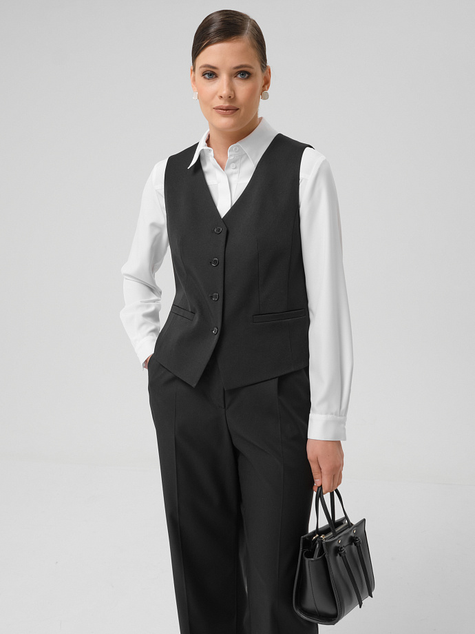 Коллекция: Базовая Сезон: Всесезон Ткань: Текстиль Подклад: Есть Длина рукава: Нет Тип горловины: V-образный Воротник: нет Линия плеча: На естественном месте Силуэт: Прямой Карманы: Прорезные с листочкой Пояс: Нет Застежка: На петли и пуговицы Длина изделия в росте: 164- 42р - 51см, 54р - 53,5см. Состав ткани: Вис 50% ПЭ 50% Рост модели на фото: 174 Размер модели на фото: 44 Жилет прямого силуэта. Комментарии к товару