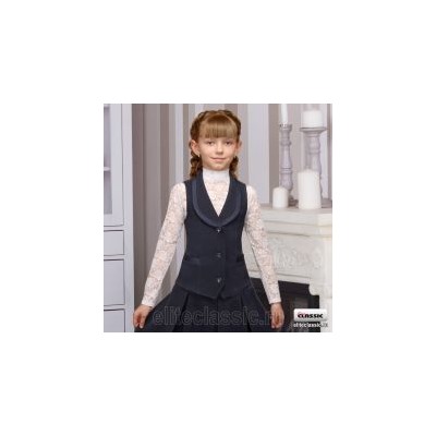 Жилет полуприлегающего силуэта для девочек младших классов с большим овальным воротником с отделочной бейкой.  По переду застёжка на петли и пуговицы, карманы в боковых частых переда, с рельефами и фигурным низом.