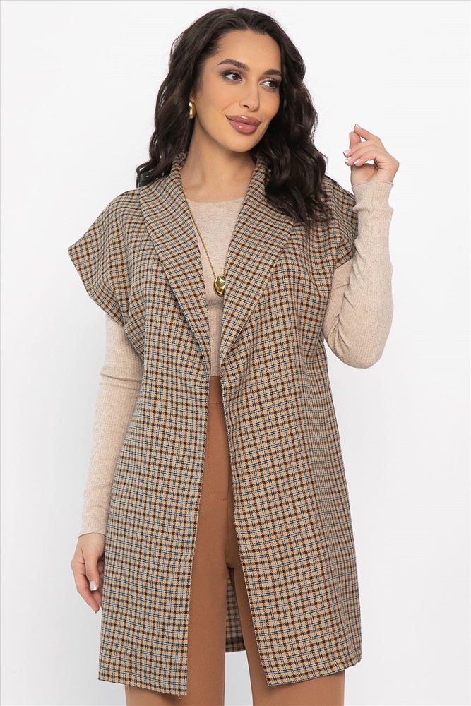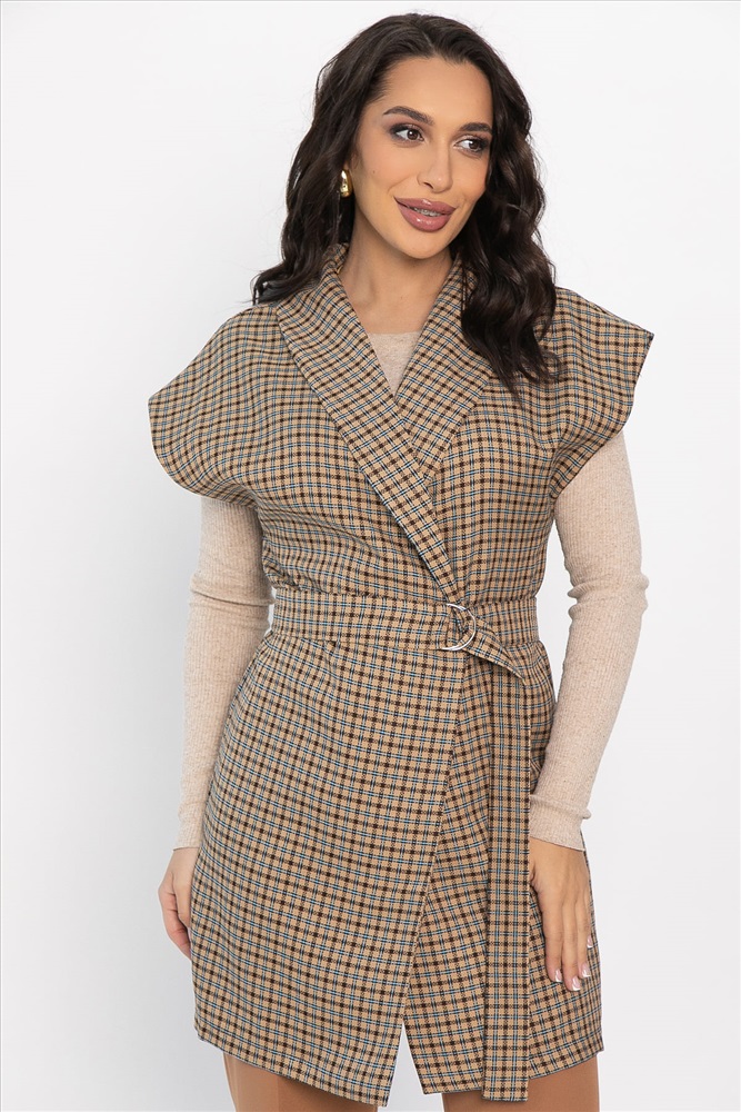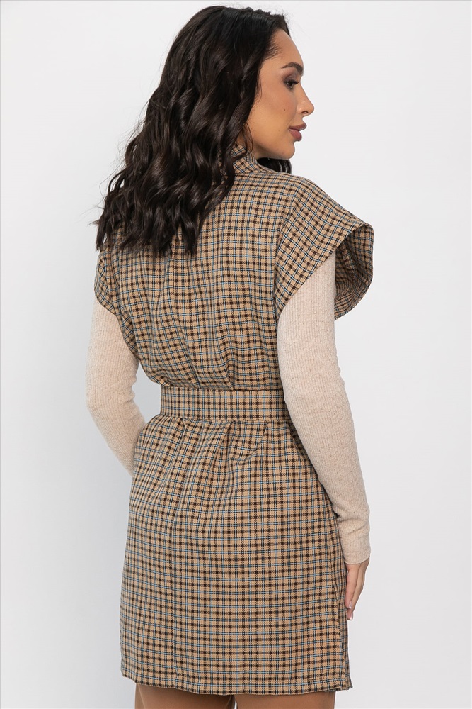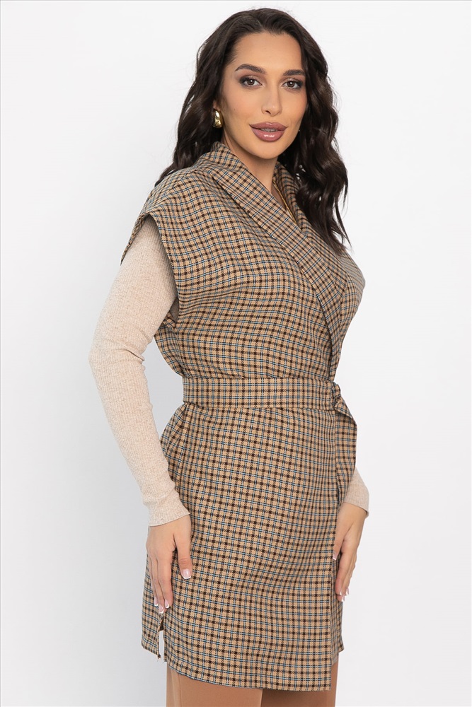 Этот жилет — сочетание классики и современного стиля. Шалевый воротник добавляет образу изысканности и уютной элегантности, а спущенное плечо создает легкую нотку дерзости и свободы. Пояс из основной ткани входящий в комплект, закрепленный на двух полукольцах, подчеркивает талию и придает силуэту стройность. Этот жилет станет стильным акцентом в любом гардеробе, сочетая практичность и утонченность.