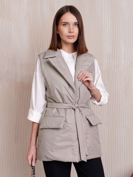 Жилет женский в повседневном стиле: - глянцевая ткань - классической крой - модель средней длинны - воротник - пояс - карманы с клапаном на кнопке - застежка на кнопке