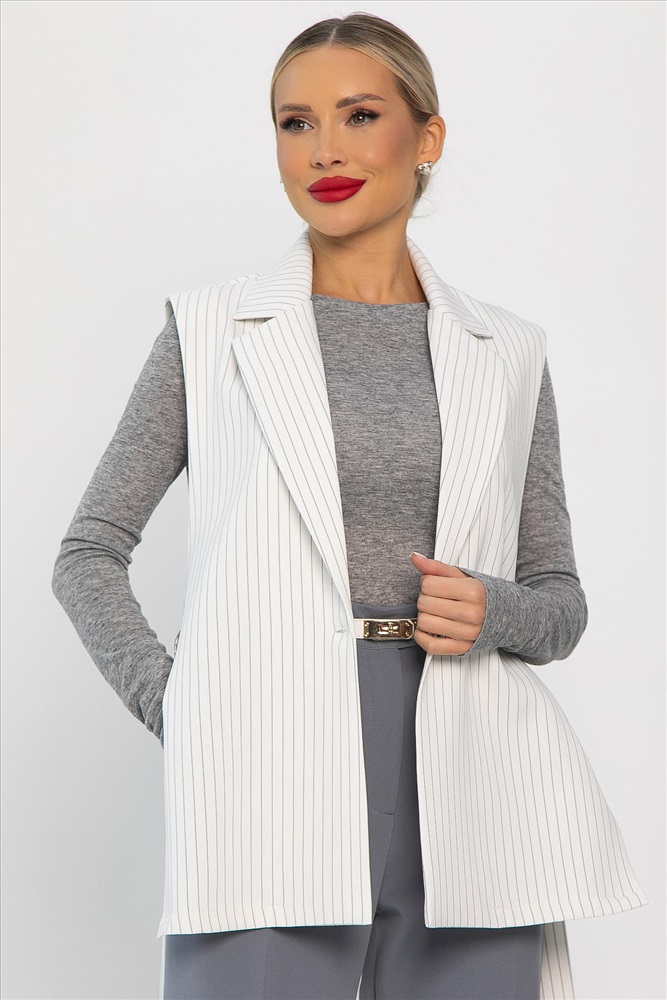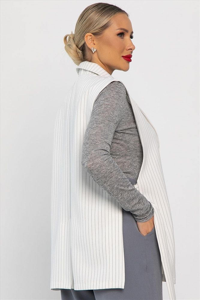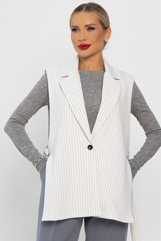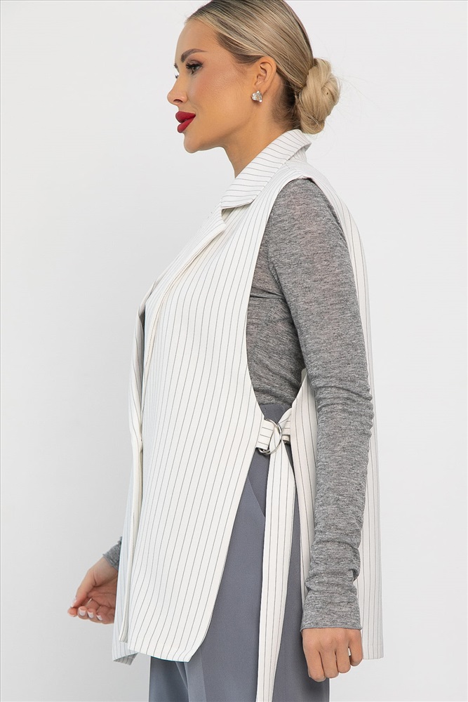 Представляем вашему вниманию женский жилет в классическом стиле белого цвета, который станет стильным дополнением к вашему образу! Жилет имеет английский воротник с пуговицей на передней части. По бокам расположены пояса на полукольцах, которые можно завязать на спине. На задней части жилета есть шлица. Жилет не соединён по бокам, но имеет пояс с полукольцами, что придаёт ему особый шарм. Это изделие станет изюминкой вашего гардероба. Сочетайте её с юбкой-карандаш, джинсами, платьем или брюками, чтобы создать неповторимый образ.