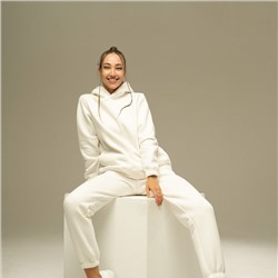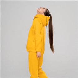 Женский костюм-двойка из футера с начесом молочного и горчичного цвета в стиле "оверсайз". Толстовка свободного силуэта с капюшоном и длинными рукавами. Карманы в боковых швах. Капюшон объемный двойной. По низу рукавов - резинка, низ изделия на поясе из основного полотна. Брюки с широким цельнокроенным поясом и боковыми карманами. По низу брюк - резинка. Изделие выполнено из трикотажа премиального качества - ПЕНЬЕ, с содержанием хлопка более 80%