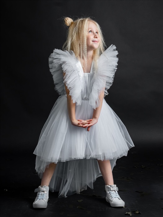 Нарядное платье из атласа, из сетки черного цвета для девочки с подкладкой из хлопкового полотна . Лиф платья из атласа , бретели отделаны сеткой. По линии груди и талии вставлена резинка для лучшего прилегания. Пышная трехслойная юбка удлиненная сзади, верхний слой из легкой сетки, средний- из атласа, подкладка юбки- из хлопкового волокна.